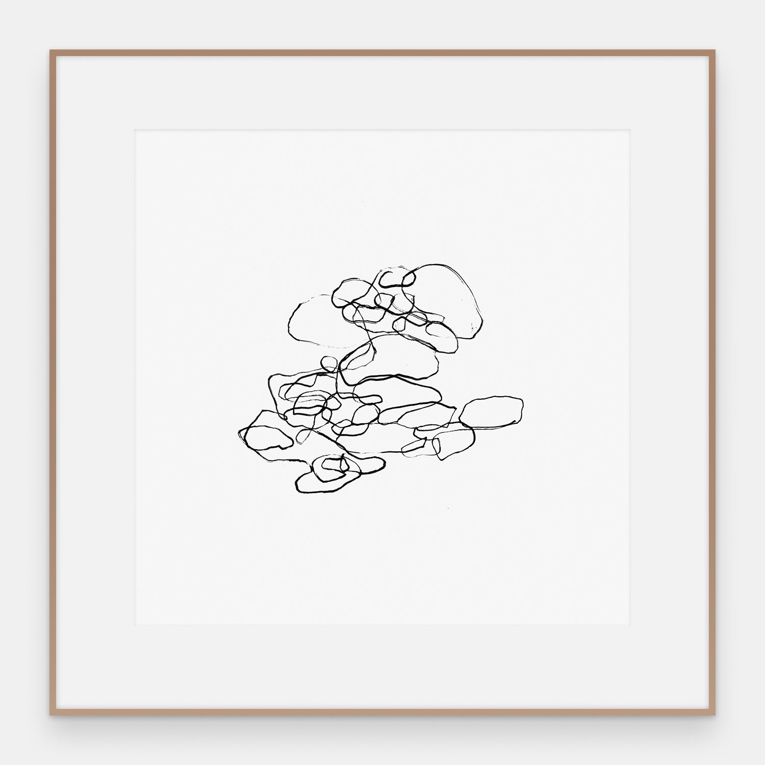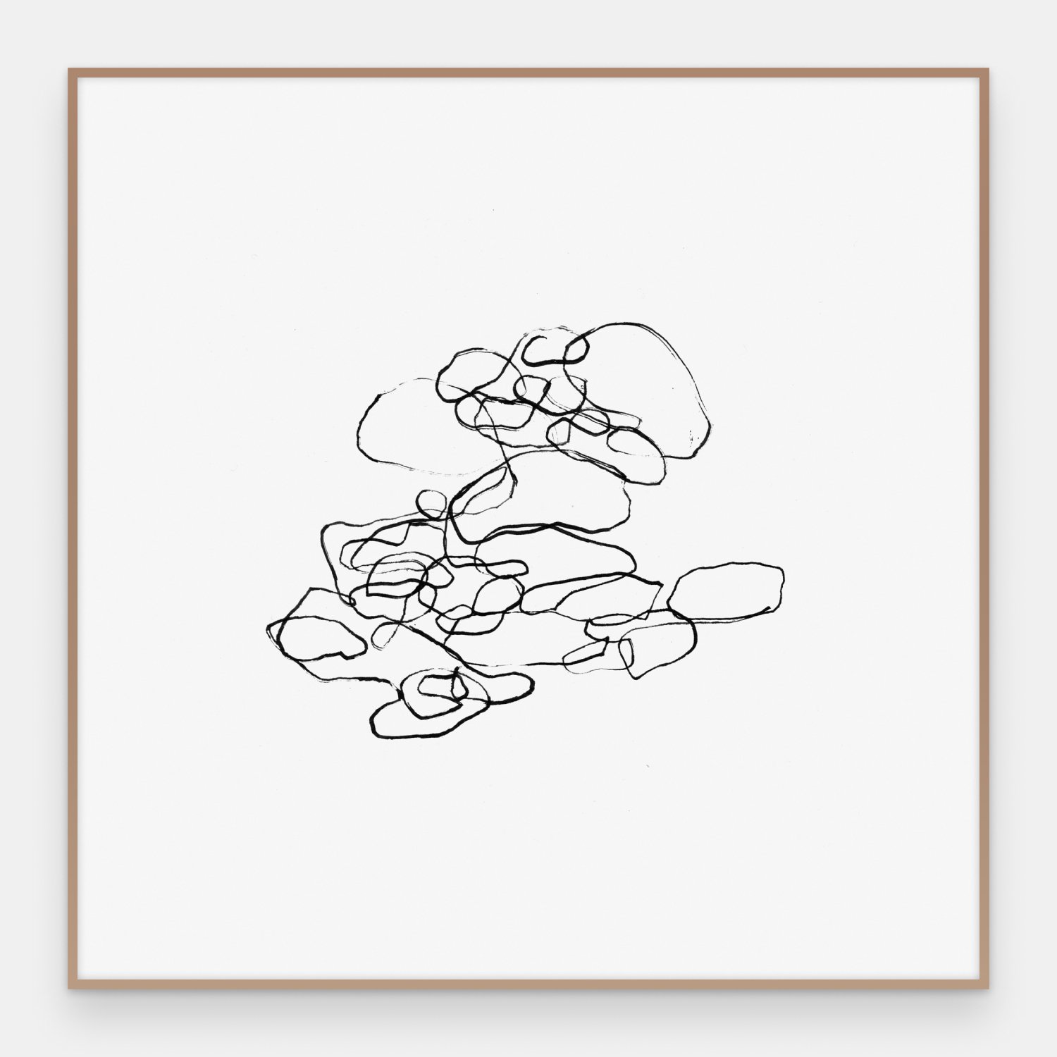 Løse, skisserte omriss tegnet med svart tusjstrek mot hvit bakgrunn. Linjene er raske og overlappende — som om hånden har gått over de samme formene flere ganger uten å bestemme seg. Ikke en studie av noe figurativt, men av usikkerhet.