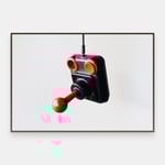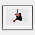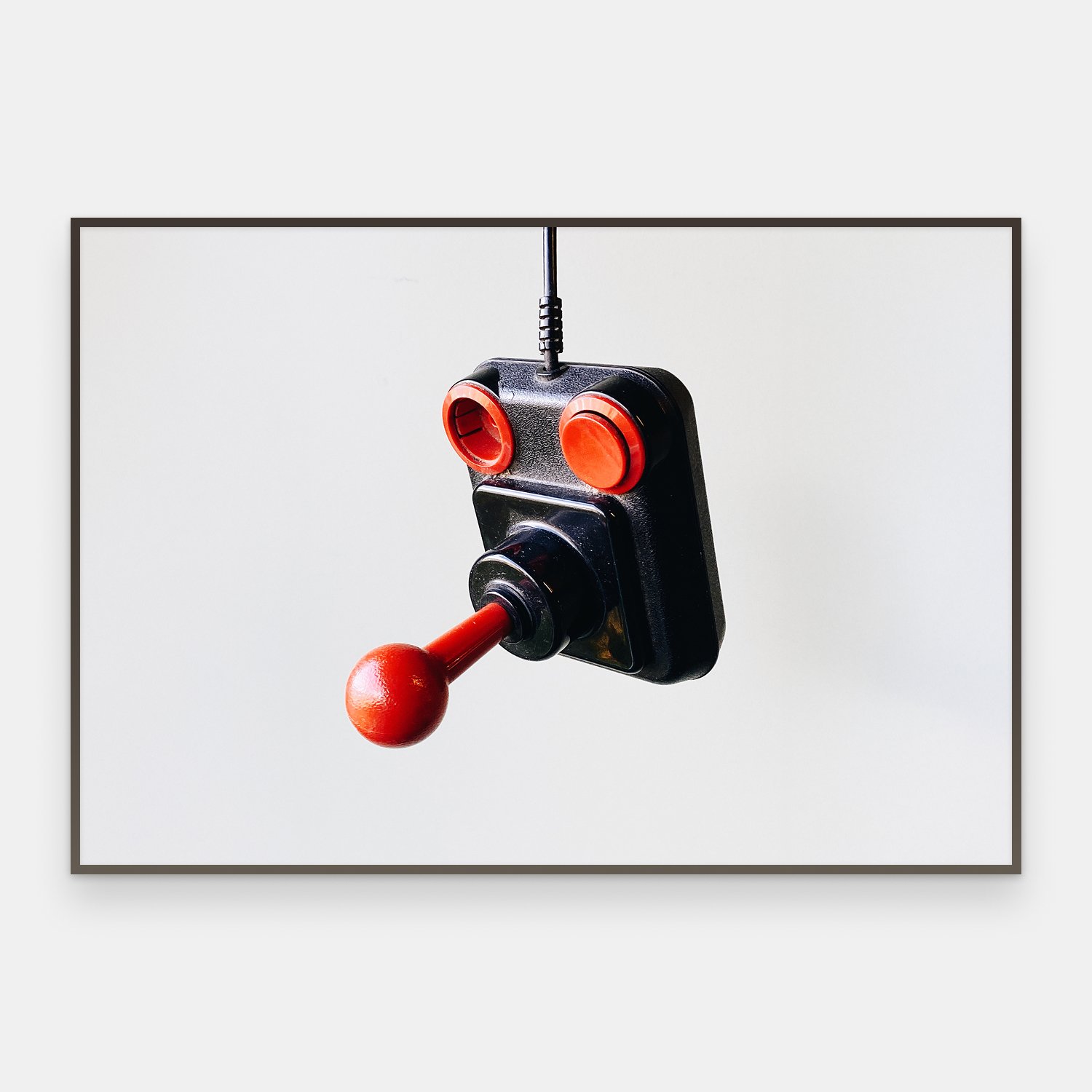En gammel joystick av typen som fulgte med Commodore 64 og lignende datamaskiner på 80-tallet, fotografert hengende i sin egen kabel. Mot den lyse bakgrunnen blir objektet til noe nesten skulpturelt — nostalgi som form.