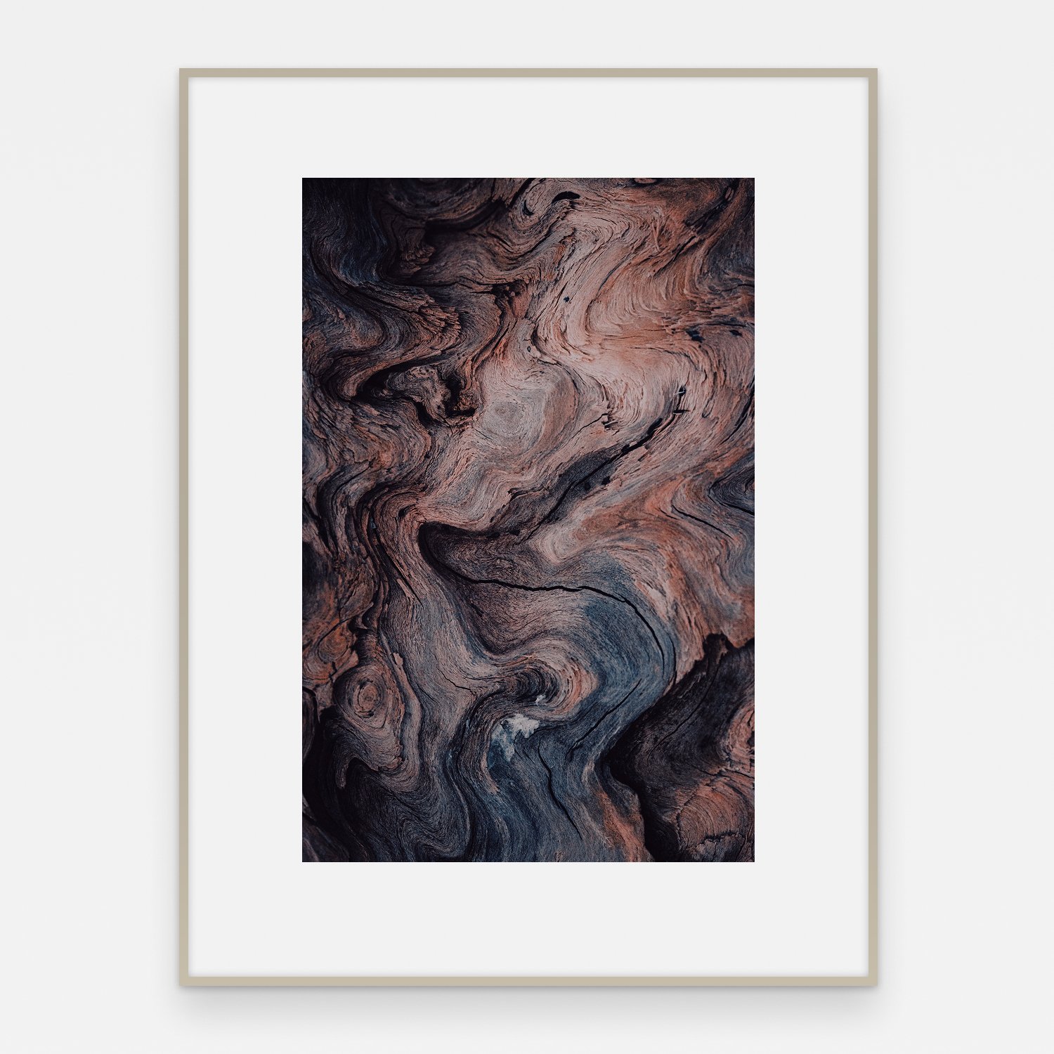 Ekstremt nærbilde av treets overflate — åringer, fibre og patina danner bølgende mønstre i rødt, brunt og mørkeblått. Så tett at motivet mister sin identitet som tre og likner mer et abstrakt maleri eller geologisk formasjon.