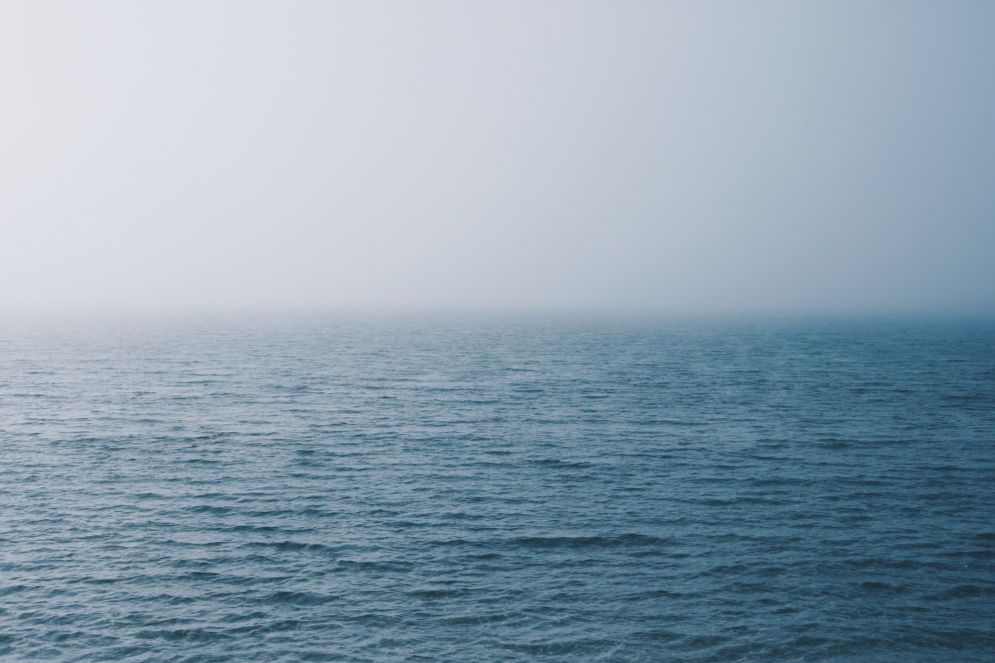 Åpent hav i overskyet lys, der horisonten nesten forsvinner i grå tåke. Hav og himmel går over i hverandre. Bildet gir ingen geografiske holdepunkter — bare det grå vannet og det grå lyset.