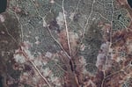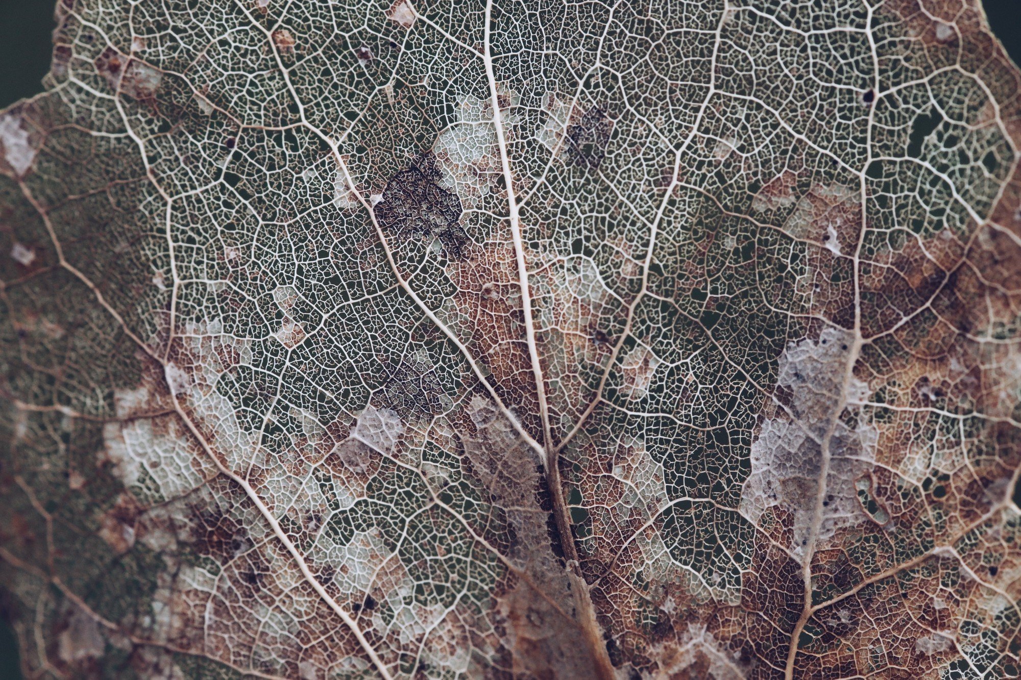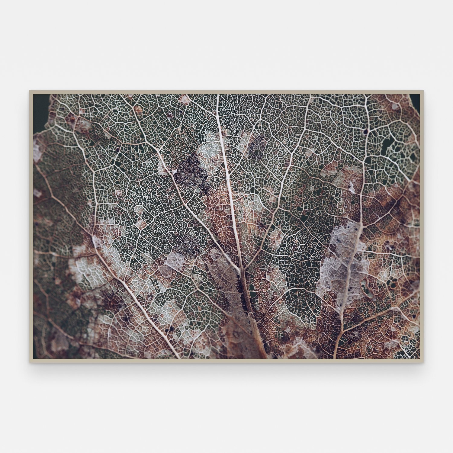 Et nedbrutt blad fotografert i ekstremt nærbilde. Det som er igjen er åresystemet — et tett nettverk av fine linjer mot mørk bakgrunn. Bladet er ugjenkjennelig som blad; det ser ut som et kart eller et anatomisk preparat.