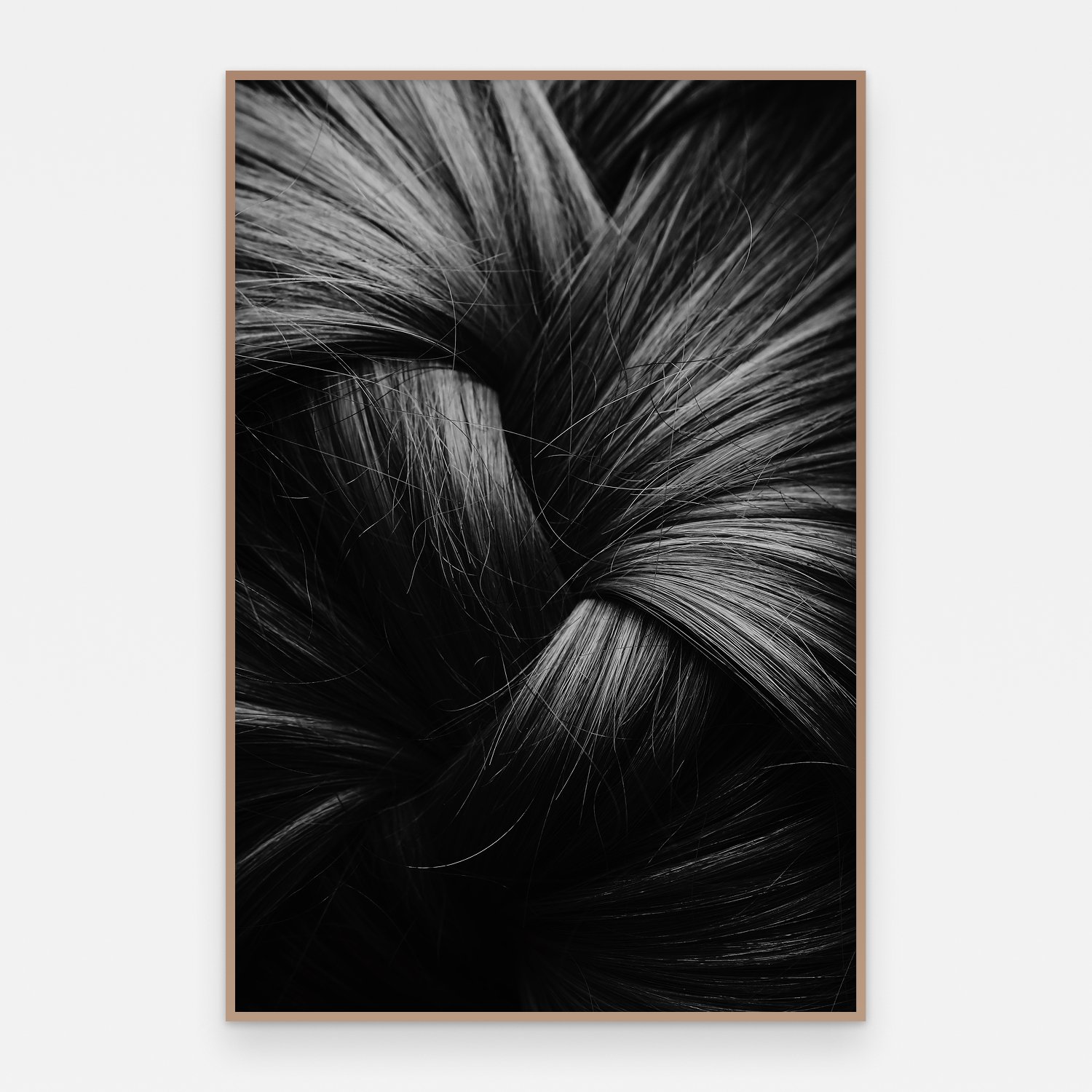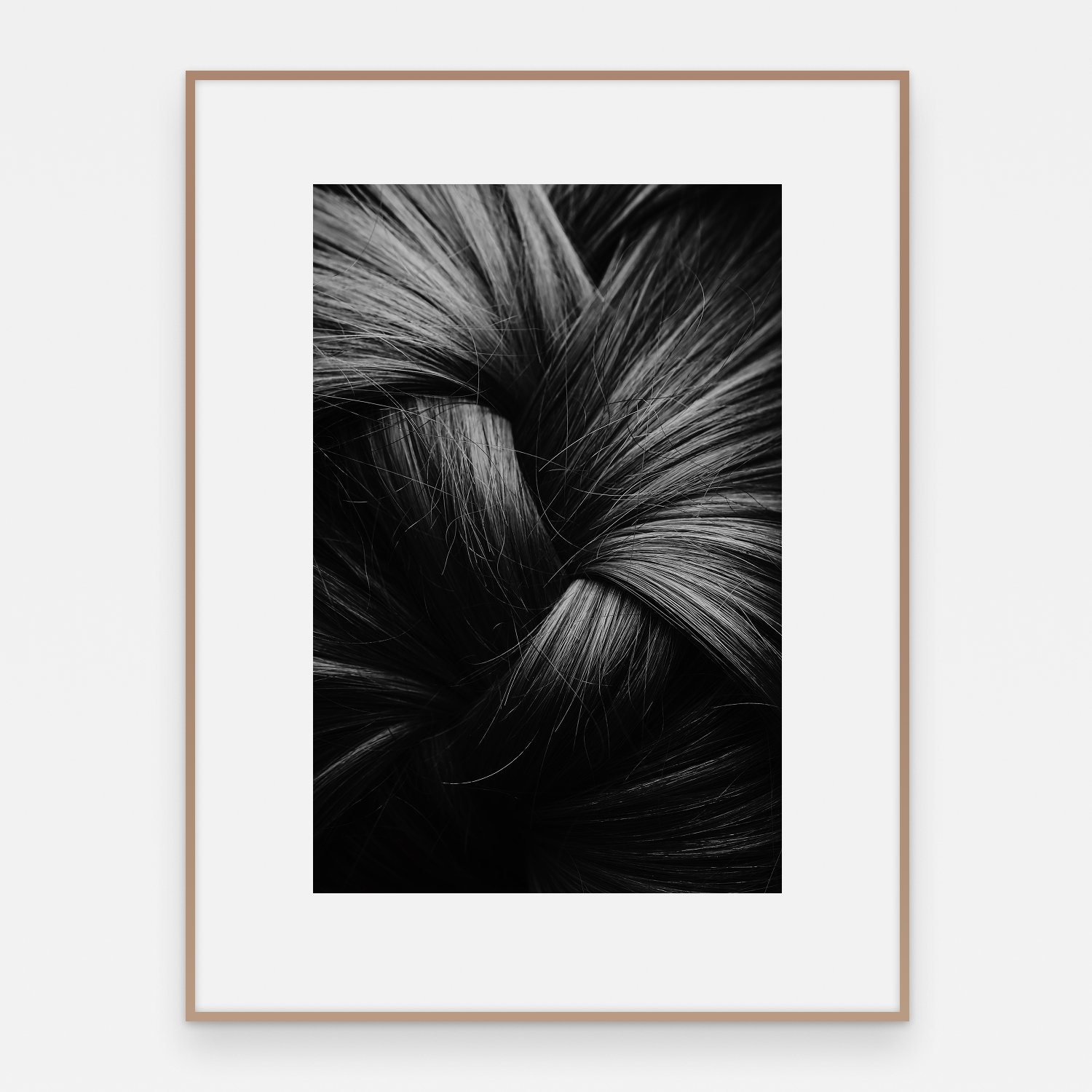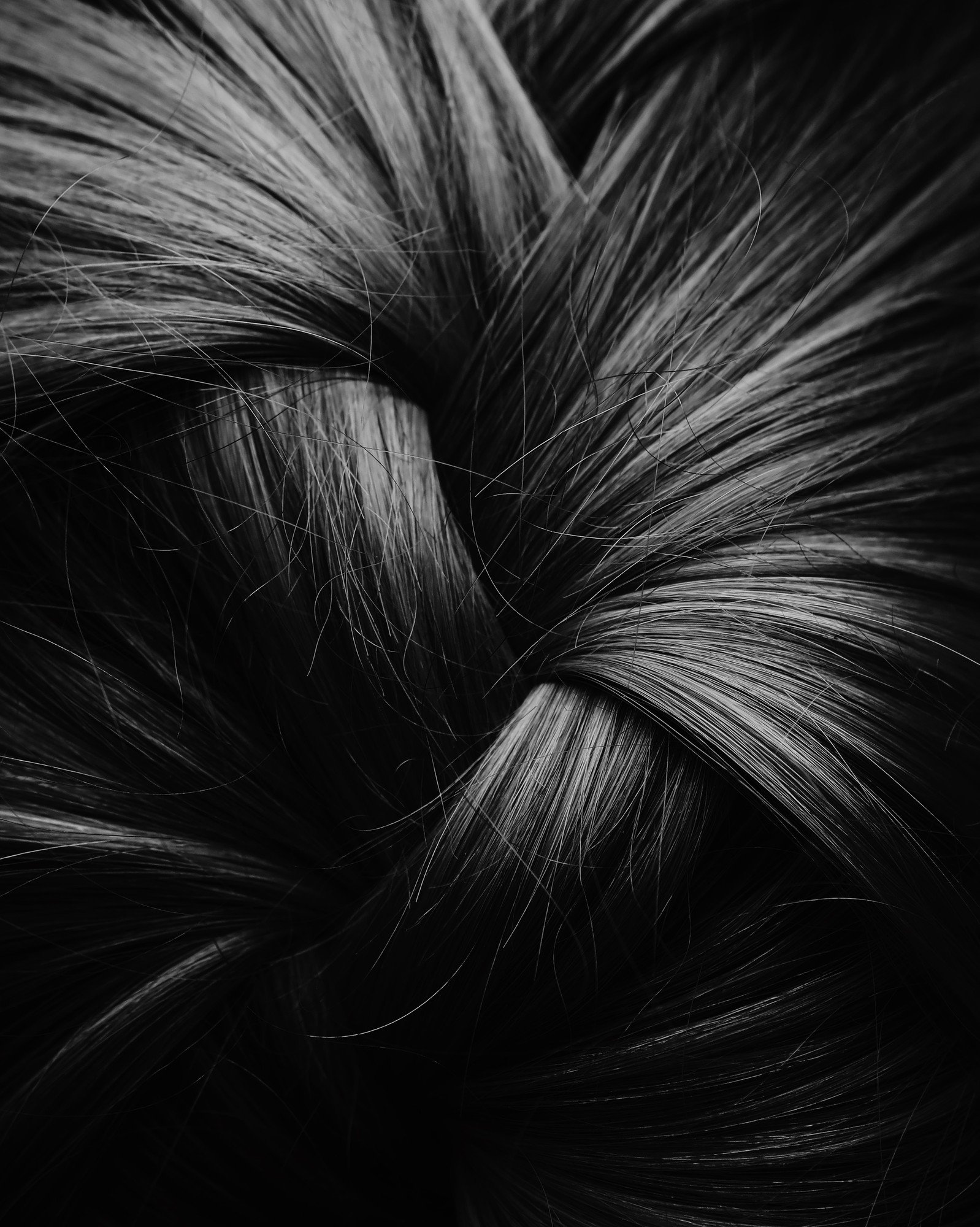 Ekstremt nærbilde av hår som er samlet i en knute. Svart-hvitt. Enkeltstrå er synlige; lyset treffer deler av knuten og lar andre deler falle i skygge. Det intime motivet er fotografert så tett at det nærmer seg det abstrakte.