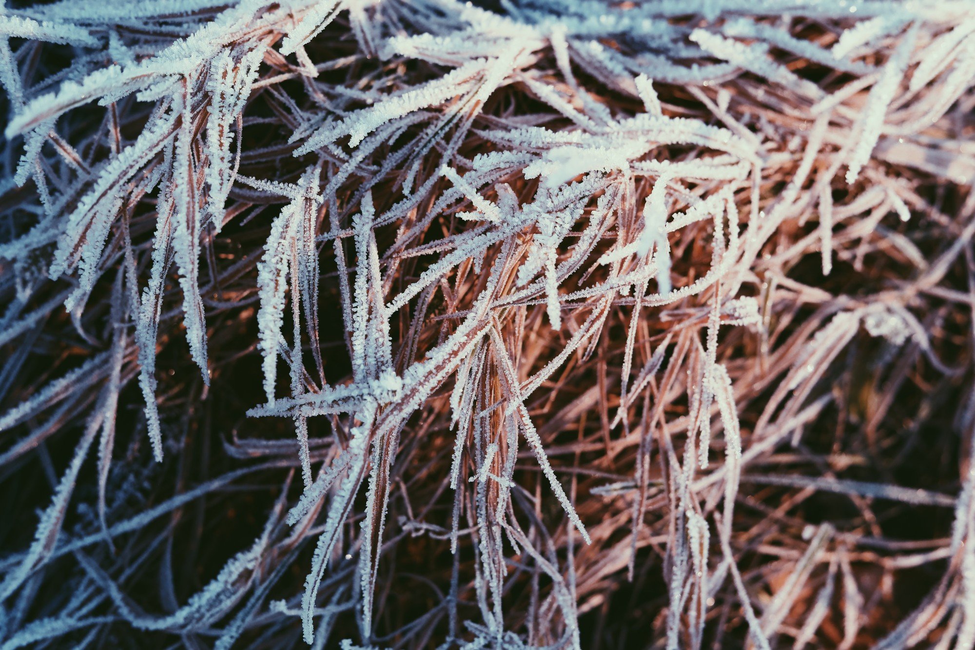 Rimfrost på høstgress fotografert i tidlig morgenlys. Isens hvite krystaller dekker hvert strå, mens gresset under beholder varme gule og brune toner. Nærbilde fra bakkenivå.