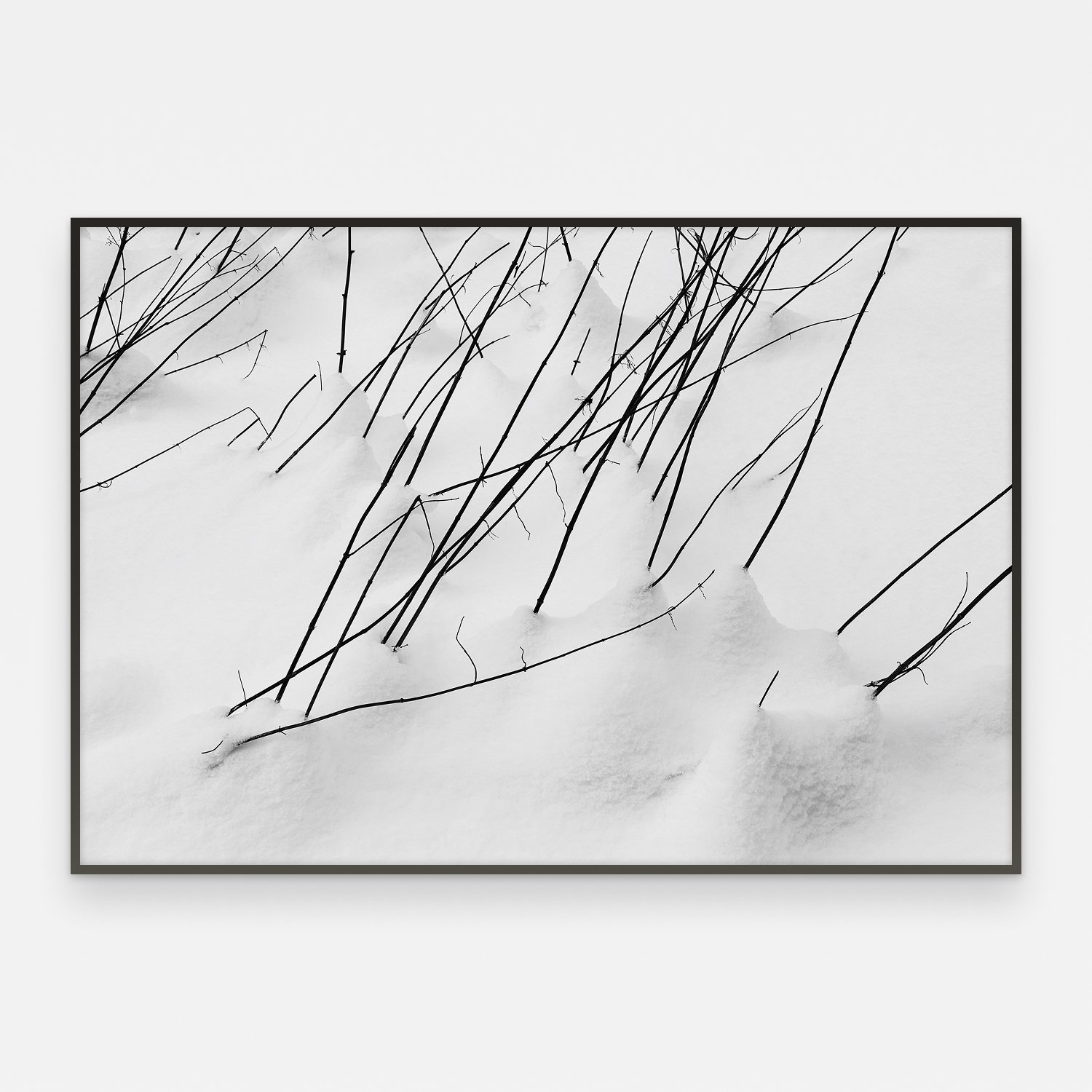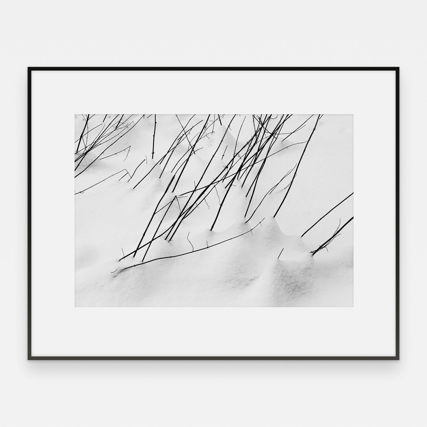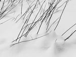 Tynne gresstrå og kvister stikker opp gjennom flat hvit snø. Svart-hvitt, høy kontrast. Motivet er enkelt og grafisk — mørke vertikale linjer mot en hvit flate.