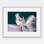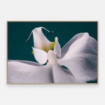 Nærbilde av innsiden av en hvit orkide mot dyp blågrønn bakgrunn. Kronbladene folder seg innover; to mørke støvbærere er synlige i midten. Bakgrunnsfargen og den hvite blomsten gir bildet et sterkt fargekontrast.