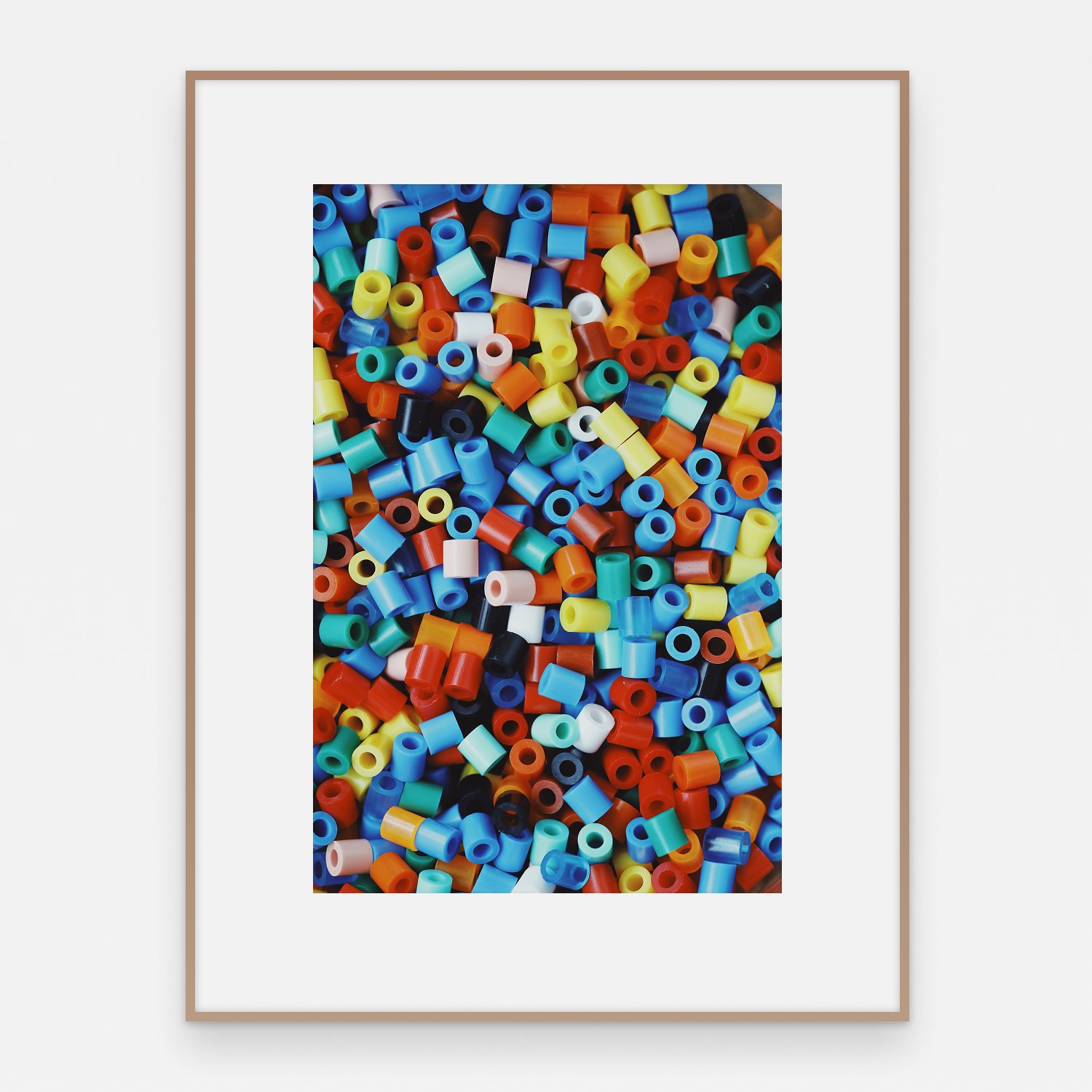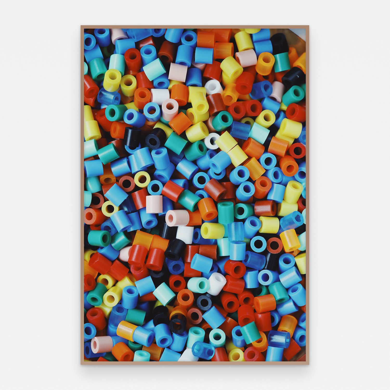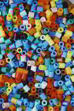Tusenvis av fargede plastperler av typen Hama-perler, fotografert ovenfra slik at de fyller hele bildet. Rød, blå, gul, grønn, hvit, sort — alle fargene i tett samling. Grafisk og fargerikt.