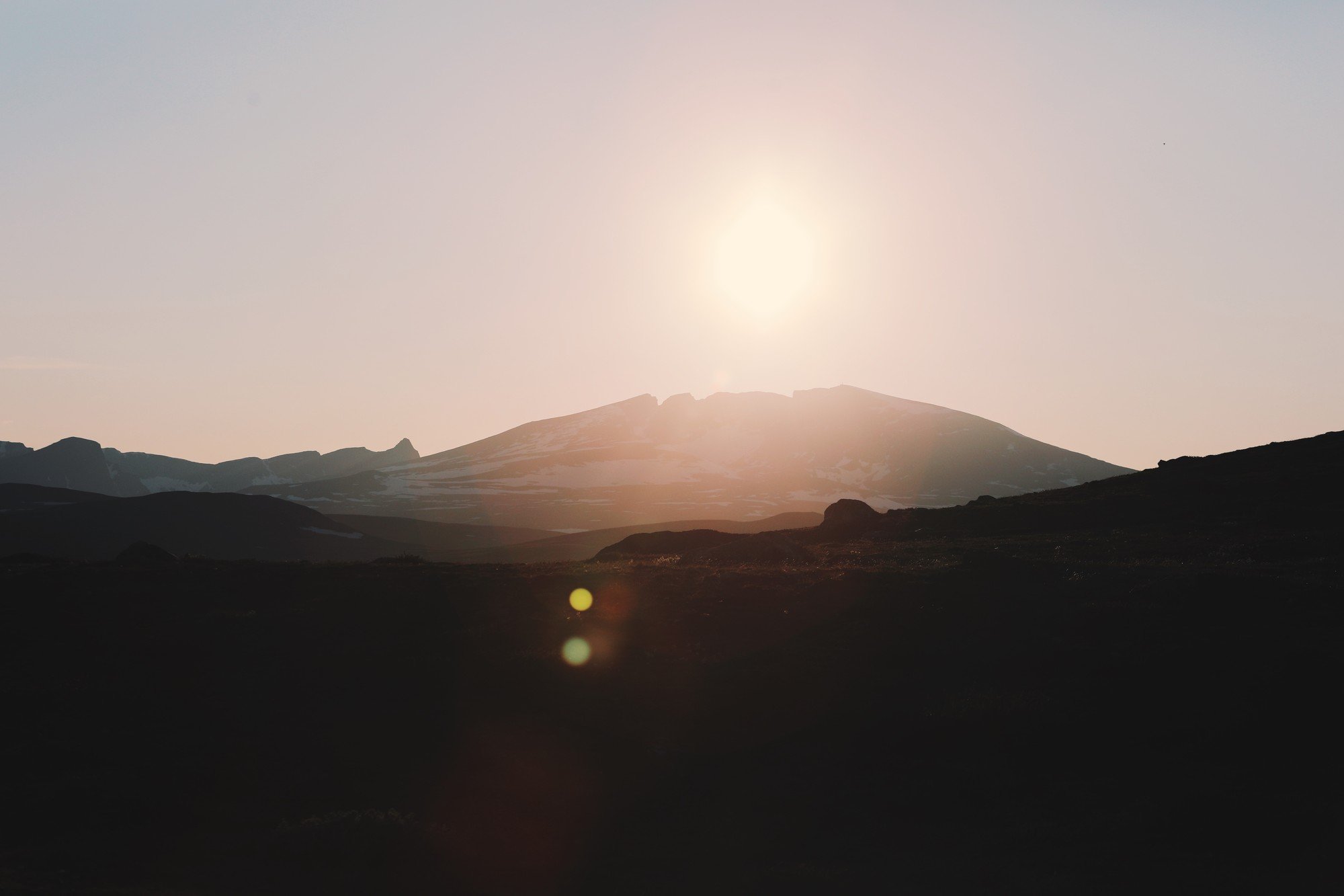 Snøhetta fotografert mot kveldshimmel. Solen befinner seg rett bak toppen og lager en klar lysglorie. Silhuetten av fjellet er mørk og skarp mot det lysere himmelen rundt og bak.