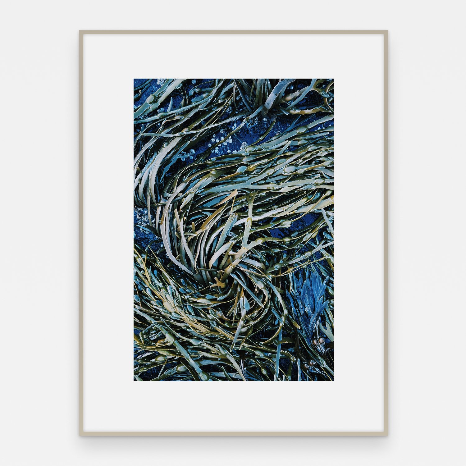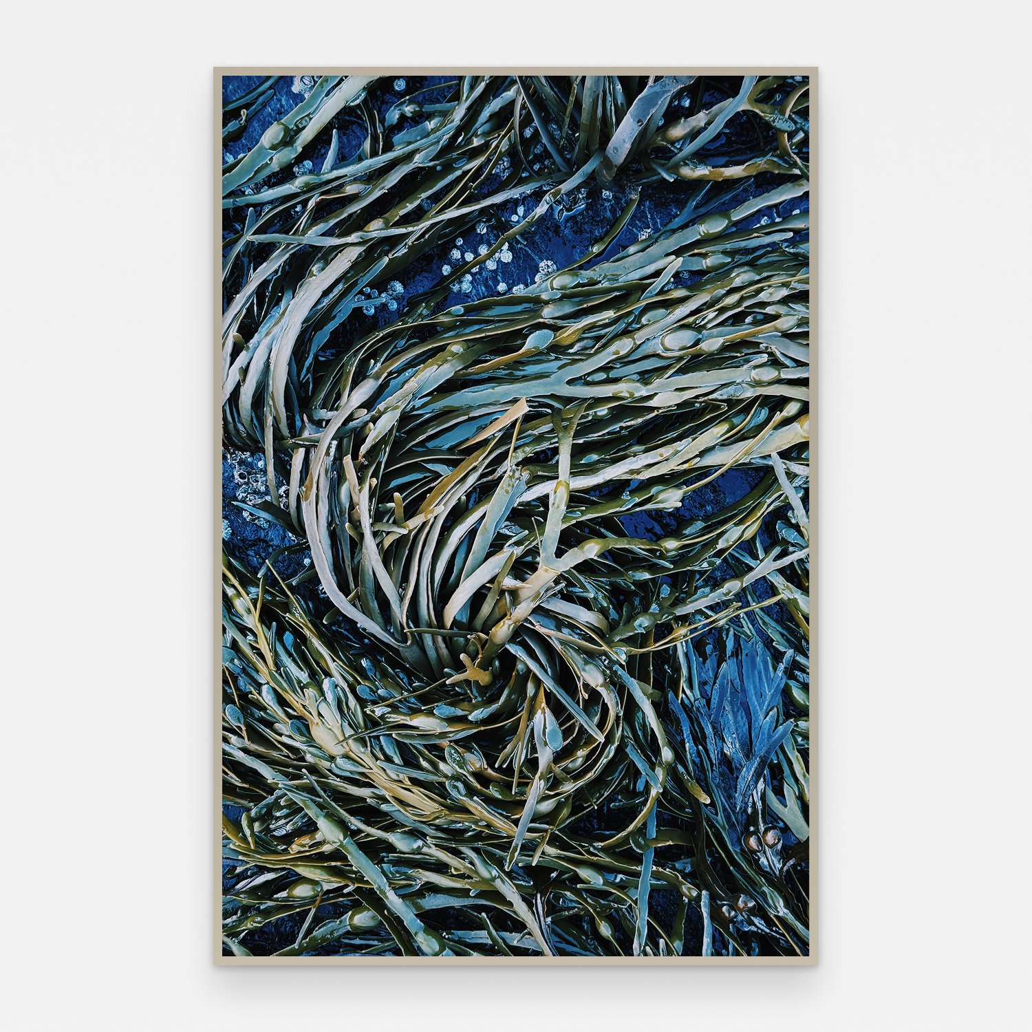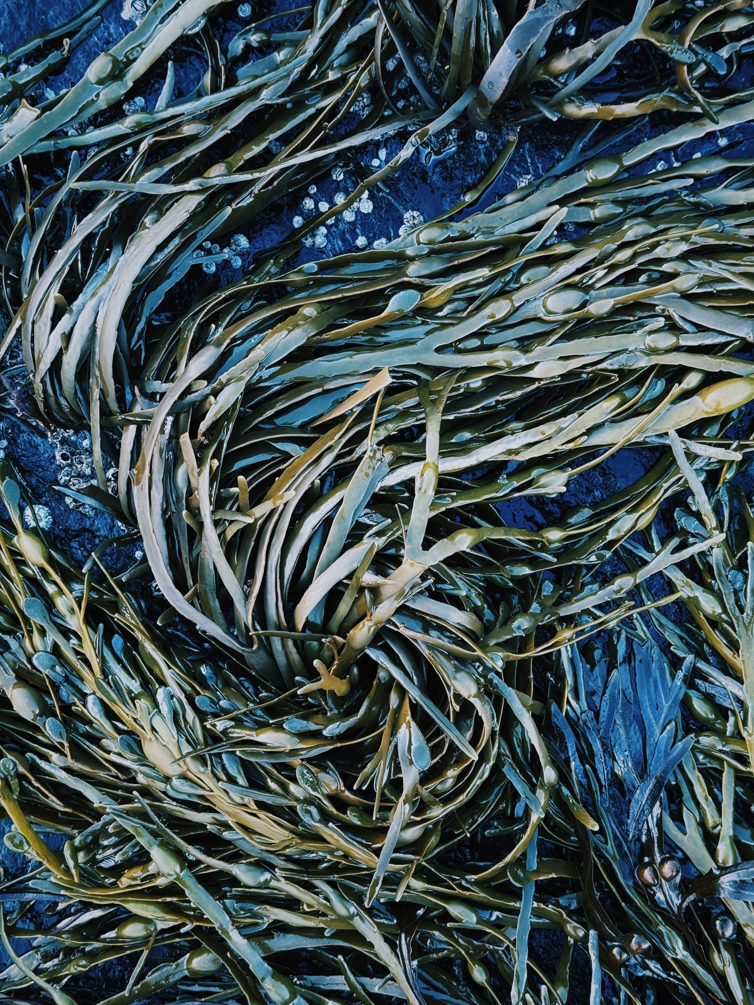 Tang i dype blå og grønne farger, fotografert i tett nærbilde. Bladene overlapper hverandre i lag. Det er vanskelig å si om algen er under vann eller nettopp trukket opp — begge deler er mulig.