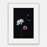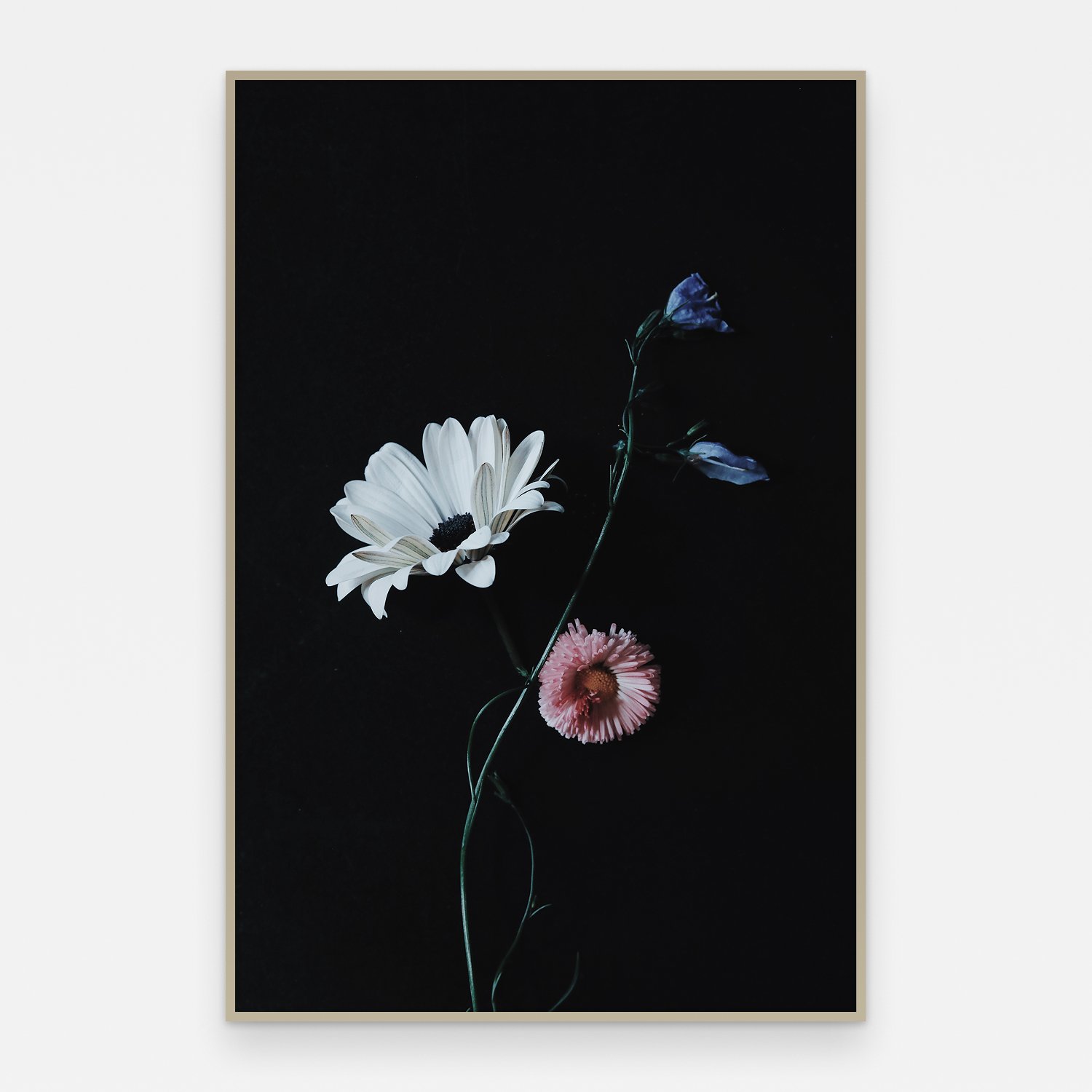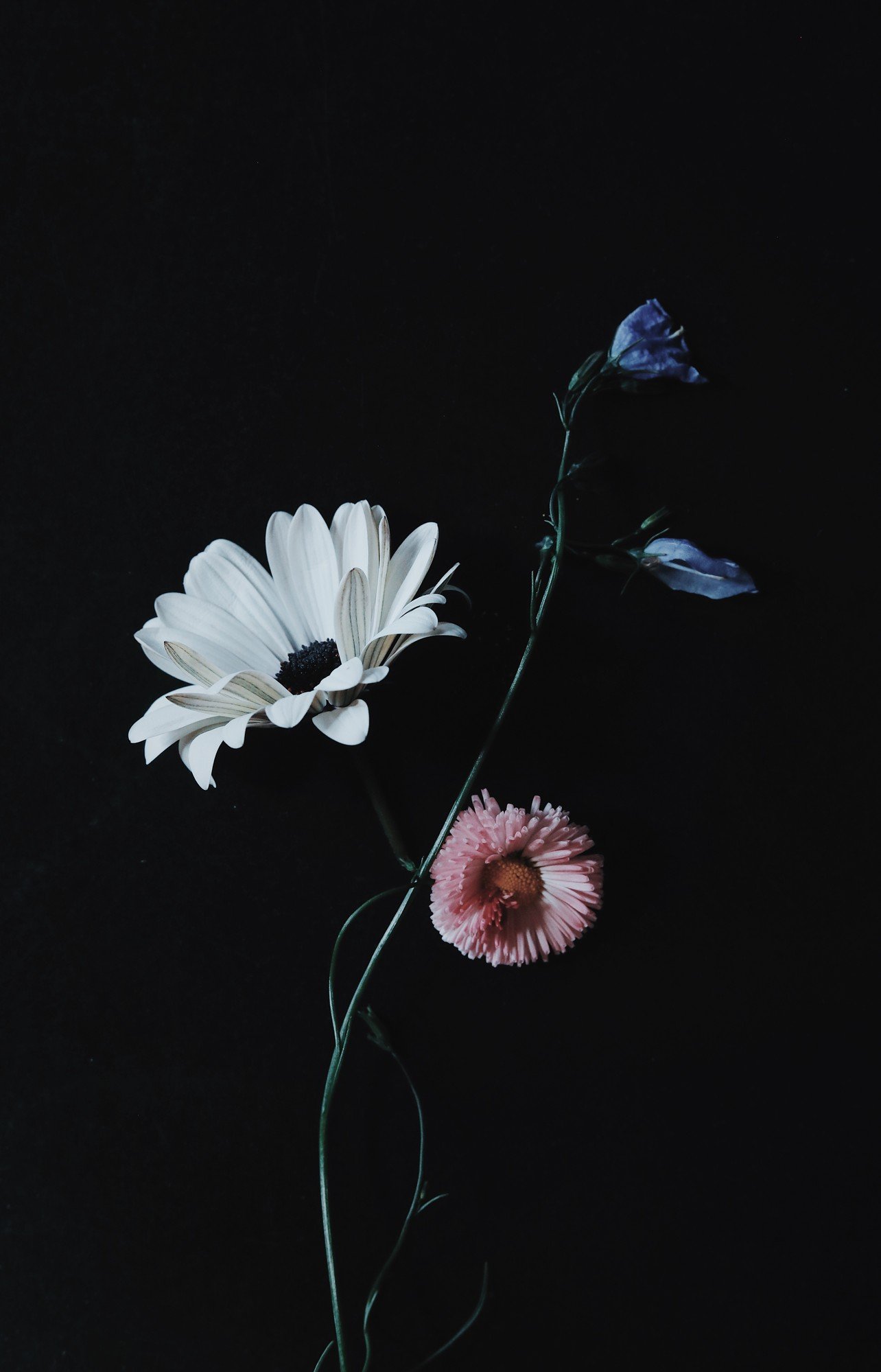 Tre blomster — én hvit, én rosa, én lilla — fotografert mot svart bakgrunn. Blomstene er plassert nær hverandre men tilhører forskjellige arter. Den mørke bakgrunnen gjør fargene sterke og formene klare.